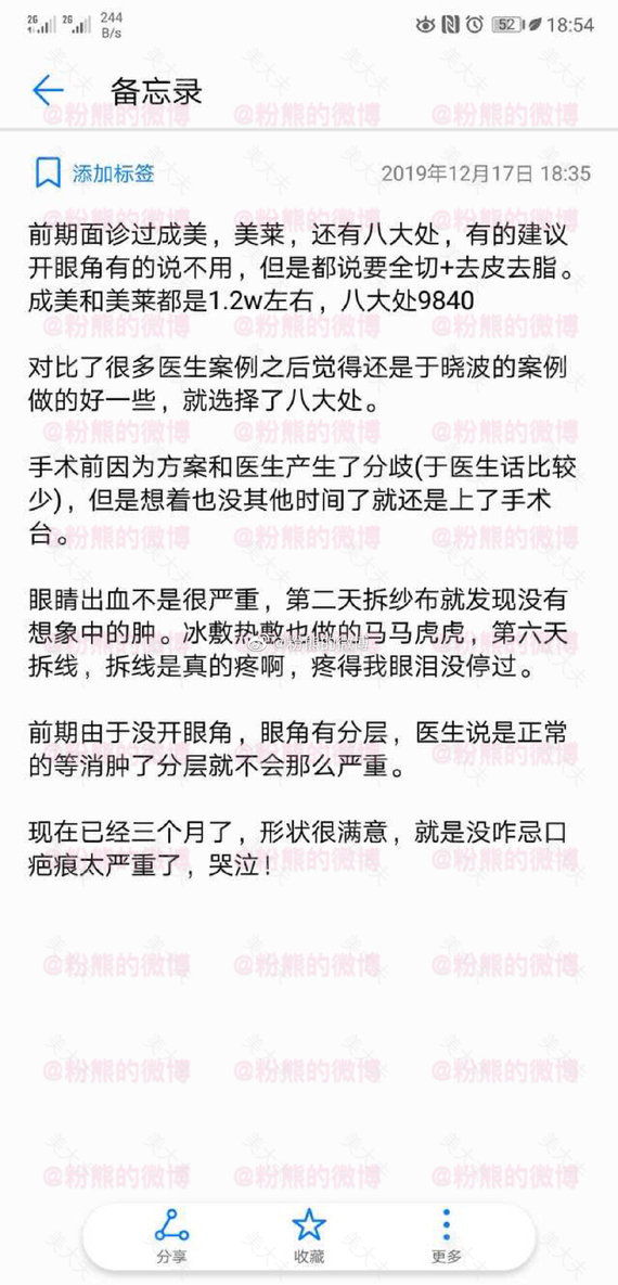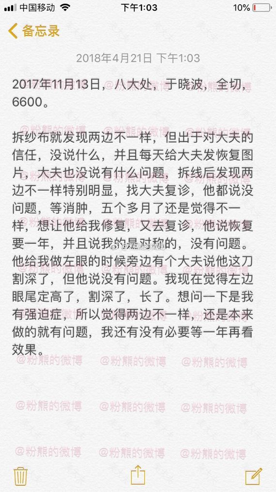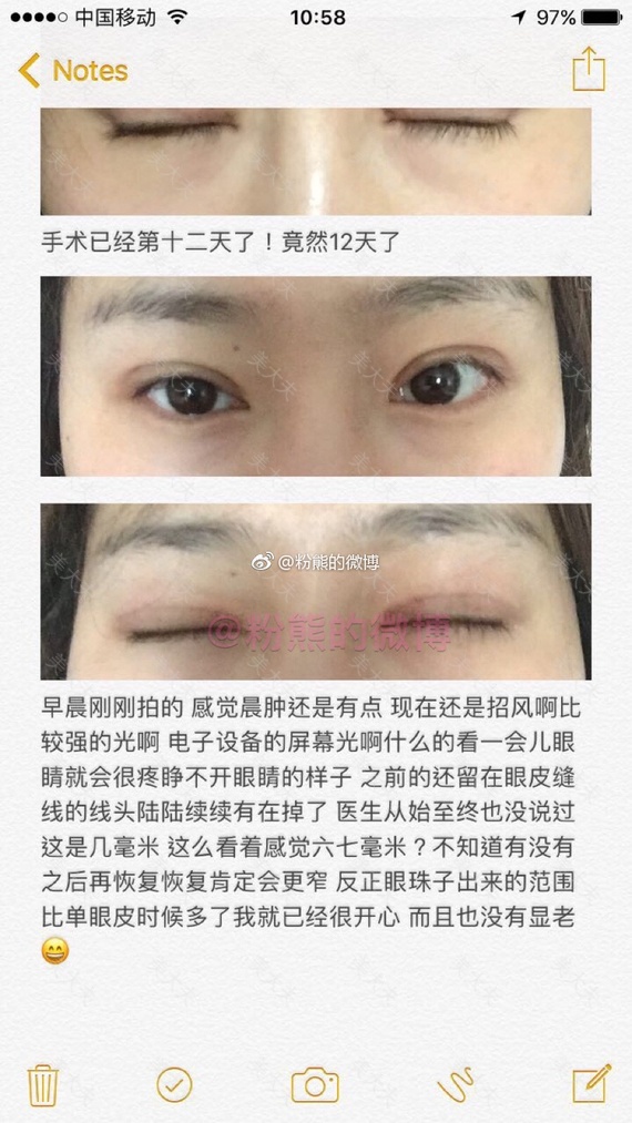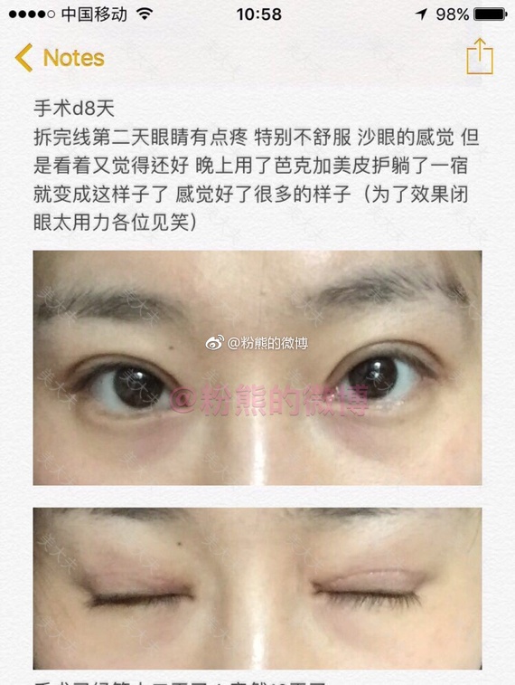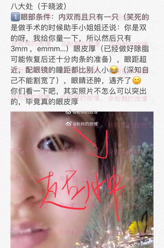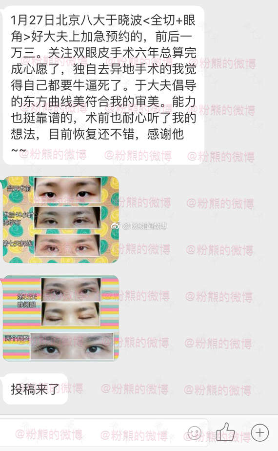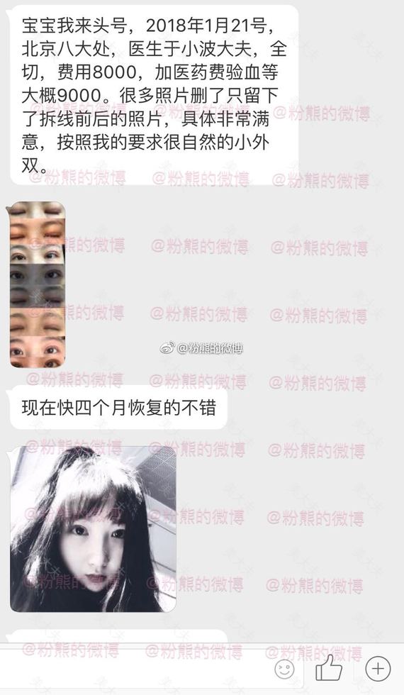 粉熊的微博一双眼皮投稿2019年1月10日,八大处,于晓波,全切去皮去脂,费用9000多。#微博投稿一一双眼皮#双眼皮