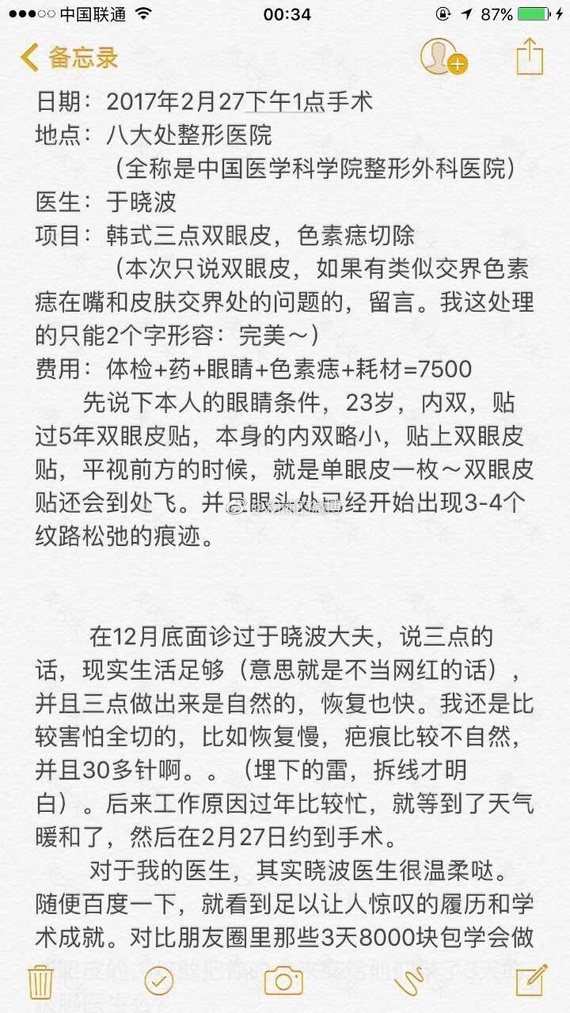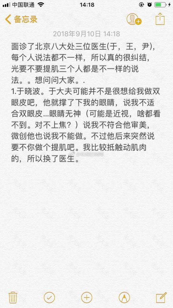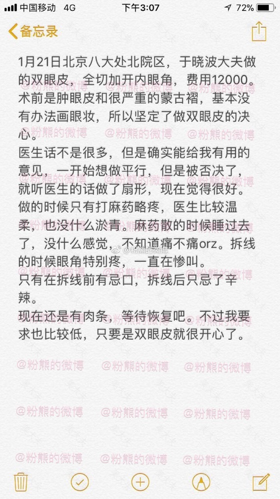 #粉熊的微博一双眼皮投稿#2018年1月21号,北京八大处,医生于晓波大夫,全切,费用8000,加医药费验血等大概9000。