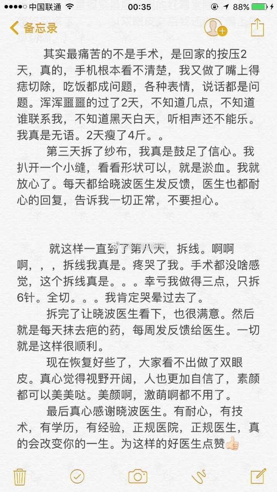 术前收到了小助理发来的注意事项和术后护理、反复看了很多遍。手术当天还是很紧张的、躺在手术台上的时候、觉得很无助、但是晓波医生不断跟我聊天、消除我的紧张、手术很顺利。