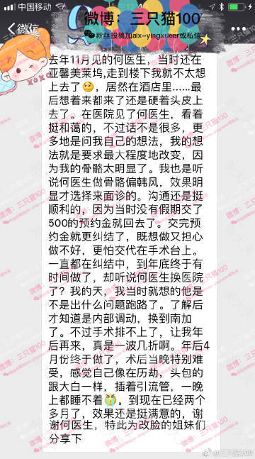 妹子术后三个月在何照华群里反馈时,我问她要的投稿儿,现已术后半年,效果非常满意觉得颧骨颧弓推了特别多,变化特别大、没有下垂、不疼、嘴巴张开也正常。她选何医生是因为他的方案更适合自己。她术前非常害怕、怕死,南加医院很负责。