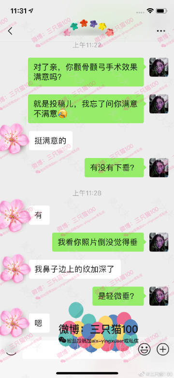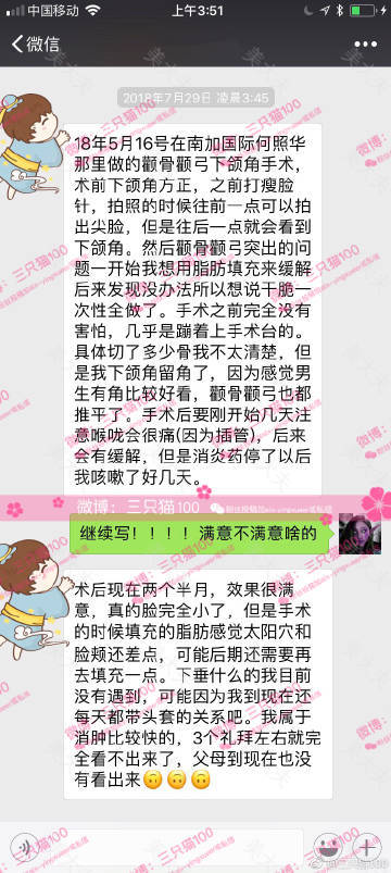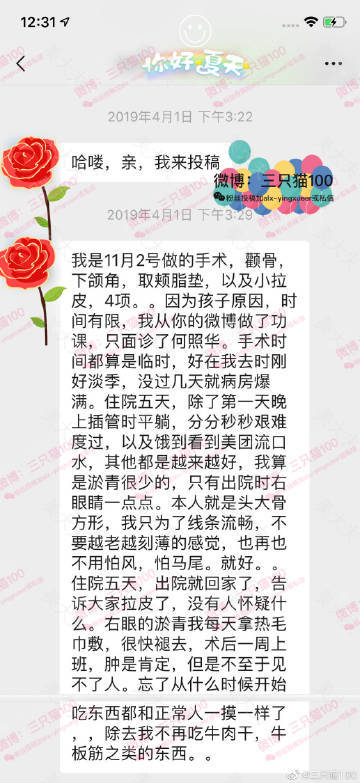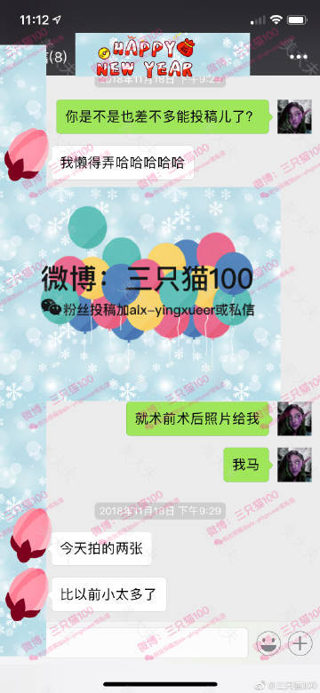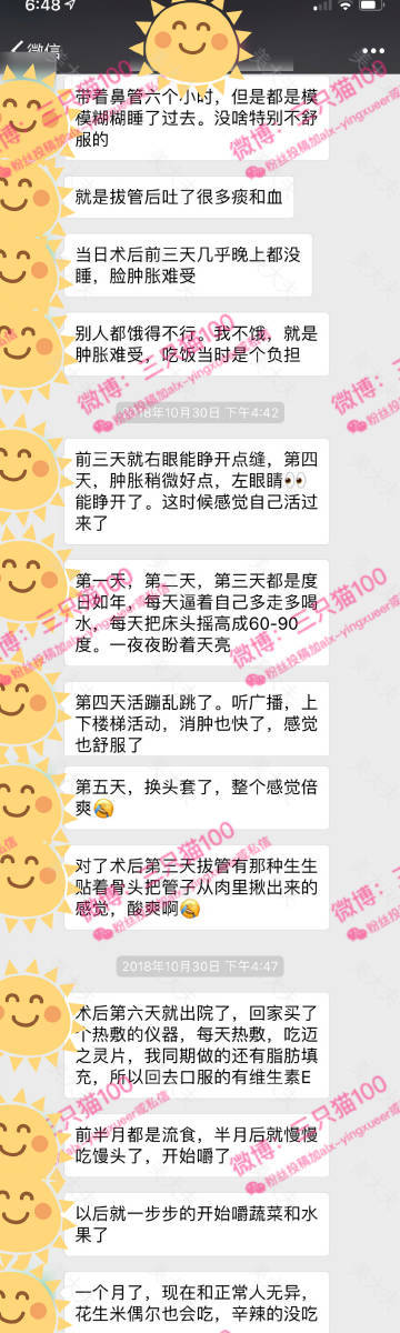 这个妹子是群里另一个妹子跟我说她效果特别好,然后我专门问她要的投稿儿。这两个妹子是同期病友,都在我群里,是同一个城市的,术后两人成为了现实好朋友,那个妹子说她现实看这个妹子觉得她轮廓特别流畅,效果特别好,于是我就问她要投稿儿了。