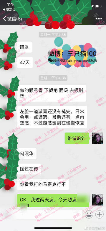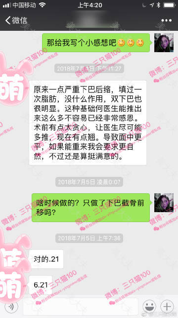 这个妹子在别人的群里发自己的术后分享,我正好看到了,立刻加了她微信问她要的投稿儿结果,7月4日的事儿,我投稿儿一多,就给忘了。这两天正好有人问我何照华颏成型,我就又翻出来了。当时妹子术后第九天,很满意