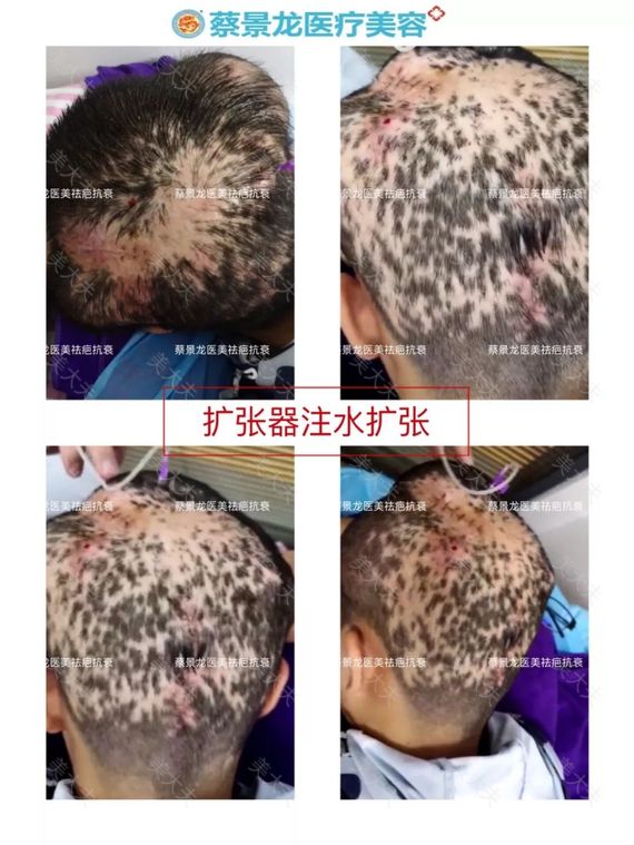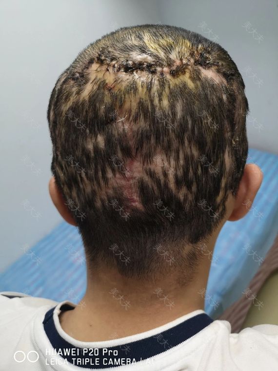 患者,男,18岁,十六年前因沸水烫伤头部皮肤,头部创面愈合后形成瘢痕。查体:一般情况可,头顶部可见大面积瘢痕15cm*8cm,形状不规则,质韧,色白,无毛发生长,枕部等散在瘢痕和毛发缺失,未曾治疗。