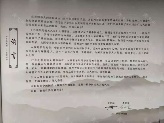 2019.10月,新书“礼赞共和国,出彩中国人”《中国医美精英风采》,由丁芷林教授总编,辛映继教授终审,医学美学美容杂志社出版发行了。这是献给共和国70岁生日的珍贵礼物,可喜可贺!