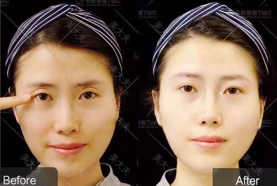而下图的,左右对比,左边是凹陷情况,右边则是正常的眼部脂肪饱满的情况,是不是右边显年轻太多呢?