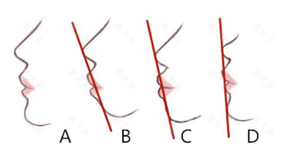另一方面,以上图为例,如果鼻尖、嘴唇和下巴三者不在同一条线上,可能是由很多不同的原因引起。以嘴唇超过E线为例,大致可分为以下三种情况:图B所示为下颏后缩,图C为唇部前突,而图D则是由低鼻尖所致。所以,如果三者不在一条线上,也不能判断出到底是鼻、唇、下巴哪一部分出了问题。