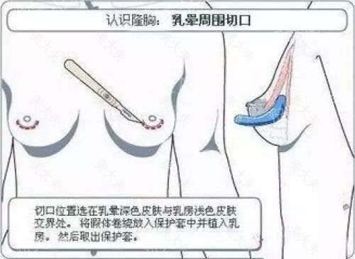 乳晕切口是按照乳晕周围皮肤的色泽差别做的一个切口,在乳晕边沿(多为乳晕下方)做一弧长为3-4cm的切口,如果乳晕偏小,切口长度不足3-4cm时,医生会在乳晕旁加做皮肤切口,以保证术中顺利将假体植入胸大肌下。