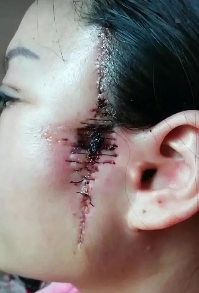 如上图,极其暴露的直线切口,惨不忍睹的强行缝合,皮肤缺损、坏死,耳朵牵拉变形......这样拙劣的手法应该不是外科医生所为,我想她应该是遇到了假医生。很显然,这不是“提升面部”的手术,这真的是在“拉皮”,而且由于皮肤之间的张力过大,线材都无法将其完全缝合,中间黑色的皮肤已经坏死。对于这种情况,即使植皮后也会留下明显的疤痕,可以说是毁容了。
