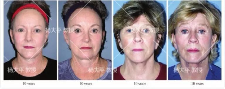 那么大家可有看出哪种技术更好?或者说存在最好的技术吗?在整形外科学界这个问题一直存在争议:对于分离范围小、层次浅的技术,一些人认为远期效果不尽如人意;对于分离范围大、层次深的,又要承担更高的并发症风险以及较长的恢复期。有的医生迷信远期效果,对面部组织进行大范围、深处理,手术耗时长,术后还要让求美者忍受长时间的恢复痛苦,远期效果也没有过于惊艳;有的医生对面部组织分离不到位,处理层次太浅,提升力量不够,求美者术后效果不尽如人意;也有的医生对分离范围、层次把握准确,在保证效果的同时兼顾手术恢复期,控制并发症风险,达到让求美者满意的面部年轻化状态。图中的4位医生,尽管采用了不同的手术方式,但术后10年,4位求美者都比十年前还要年轻。