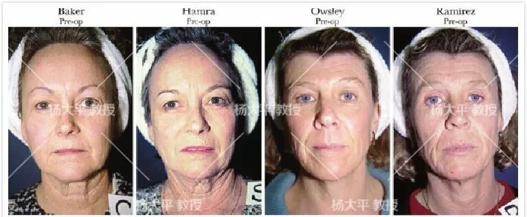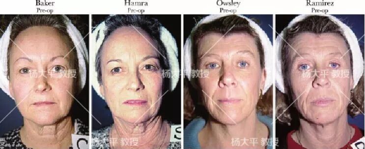 Baker医生对颧突外侧2/3区域进行游离,向前达到鼻唇沟外侧数厘米的位置,便于颧部内侧组织提紧,对SAMS筋膜层进行外侧斜形切除。这也是目前我所借鉴的面部提升手术方式。Hamra医生运用的是包括对颧脂肪垫、颈阔肌及皮肤在内的深层面部提升方式,也称复合面部提升术。Owsley医生是将皮肤和SMAS为一个单元进行扩展SMAS下分离面部提升,是传统的面部提升术式。Ramirez医生则采用了内窥镜技术,在颞深筋膜下进行平面分离。