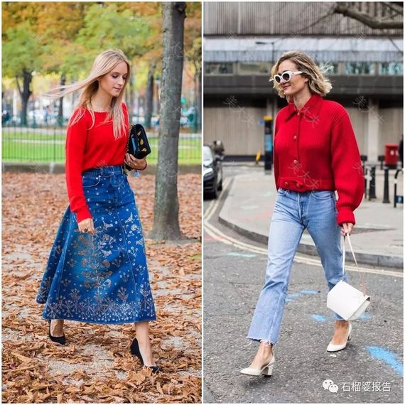 红色毛衣,浅蓝色牛仔下装能带来复古感觉,看起来没那么老气刻板。