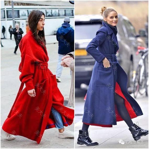 红色大衣里露出一点蓝色牛仔裤很年轻,蓝色大衣里露出红色裙摆也很有看头。