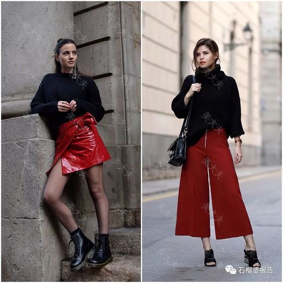 红与黑的第二种好看穿法,是把红色穿在下半身,比较不俗套。