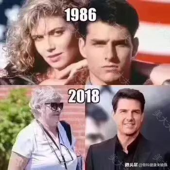 照片是1986年美国影片《壮志凌云》中的女主角Kelly McGillis和男主角Tom Cruise的剧照,当年男女主人公几乎是金童玉女般地绝配。然后命运很公平地给了两个人各自32年的岁月,没想到两个人变成了两代人。