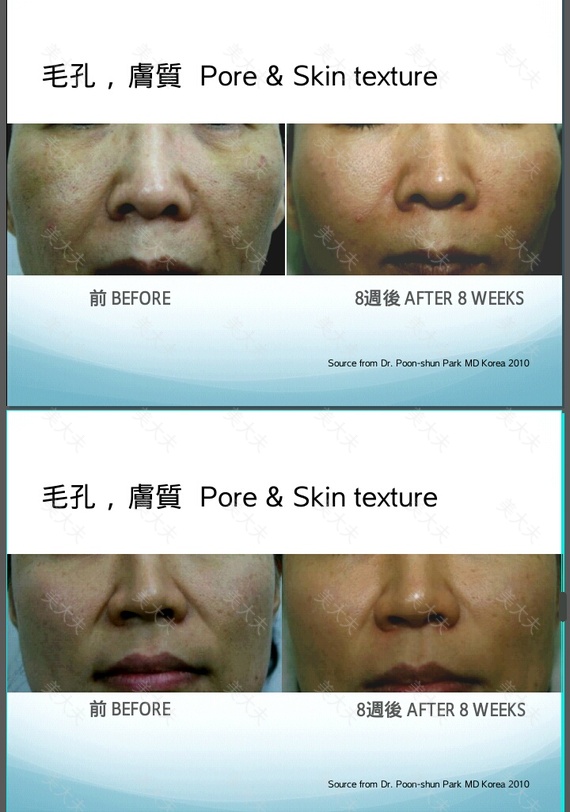 用于处理老化皮肤的各种问题如皱纹、凹洞、毛孔粗大、暗沉、色素沉著、鬆弛及粗糙等问题,均发现具有惊人的回春效果。