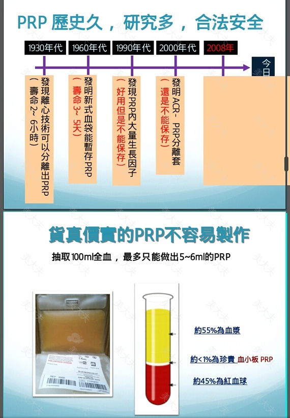 PRP 就是 血小板浓厚血浆 (Platelet Rich Plasma)它是一种超浓缩血小板是天然多重 生长因子的贮藏库,蕴含丰富生长因子(PDGF、TGF-b、EGF、FGF、IGF与VEGF等)血小板 浓度 含量高于 90万/ul一旦身体受到损伤,就会刺激PRP (血小板) 释放出自体的 多重生长因子