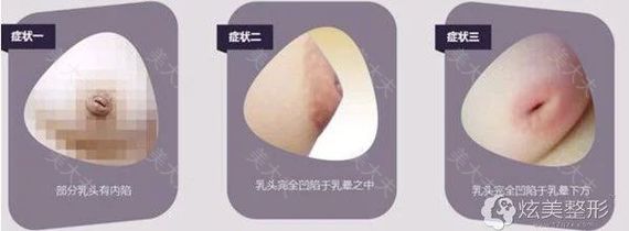 乳头内陷深浅不一可分成三度:1、轻度乳头内陷,乳头颈部存在,能轻易被挤出,挤出后乳头大小与常人相似;2、中度乳头内陷,乳头完全凹陷于乳晕之中,但可用手挤出乳头,乳头较正常小,多半无乳头颈部;3、重度乳头内陷,乳头完全埋在乳晕下方,无法使内陷乳头挤出。