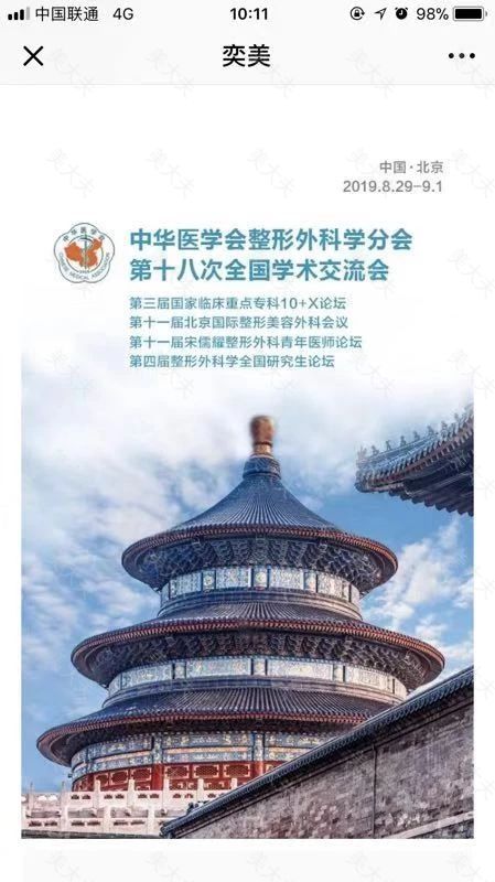 中华医学会整形外科学分会第十八次全国学术交流会由中华医学会整形外科学分会主办,中国医学科学院整形外科医院承办的2019年中华医学会整形外科学分会第十八次全国学术交流会,于2019年8月30日至9月1日在北京国际会议中心召开。中华整形外科学分会集中了目前我国整形外科学界最优秀的专家队伍,而其全国学术交流会作为我国整形外科学界权威的学术交流平台,是我国整形外科领域整体学术水平的年度综合展示。