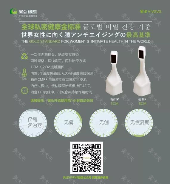 110发脉冲---总能量恒定 阴道黏膜组织是女性人体中的特殊类型组织:无痛觉末梢神经。所以约束治疗能量的极限值显得尤为重要,而蜜泌viveve所有治疗头经过精确计算,其治疗最佳能量发数为110发,以确保治疗的有效及安全性,兼而有之。