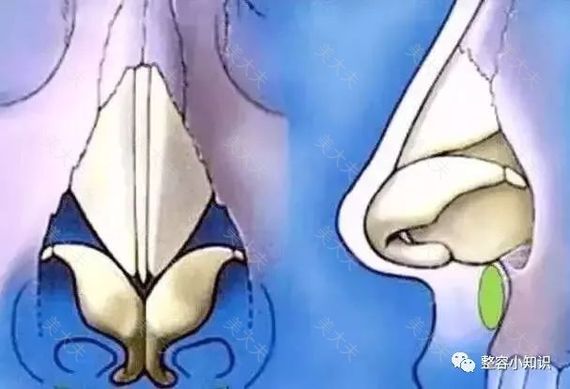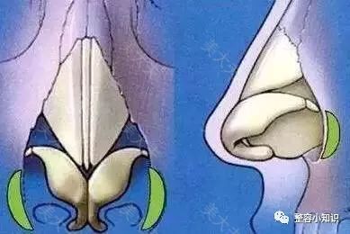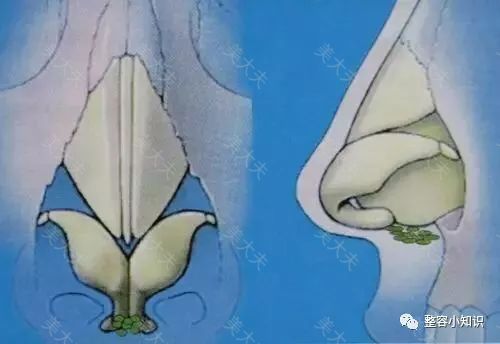 创伤比较大的方法是,分离鼻基底,把三角形假体植入。把鼻翼基底垫起来。这样可以缓冲上颌牙槽骨过突造成的台阶。