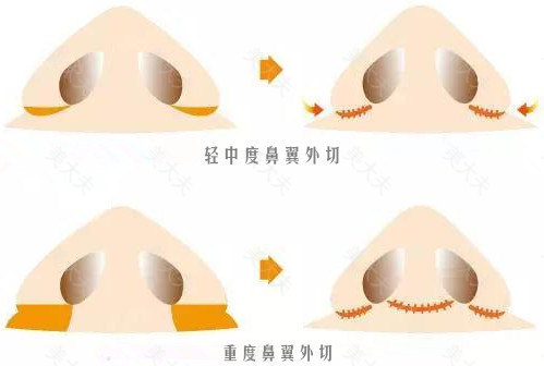 可沿鼻翼之游离缘切除一条梭形的皮肤组织使鼻翼缩小。