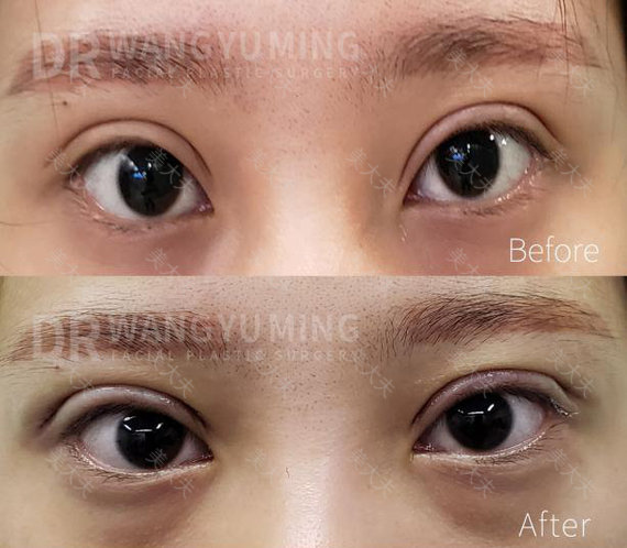 凹陷性疤痕,双眼皮线上方肥厚,可能导致眼球干燥症问题。
