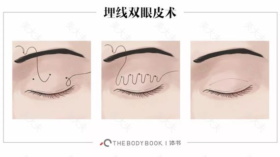 用一根缝合线沿着画好的双眼皮线固定几处,形成双眼皮褶皱,将缝线埋于皮下,术后无需拆线。