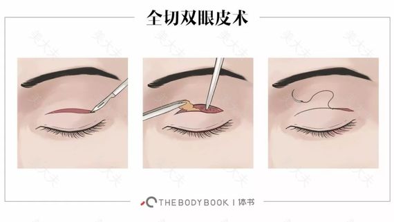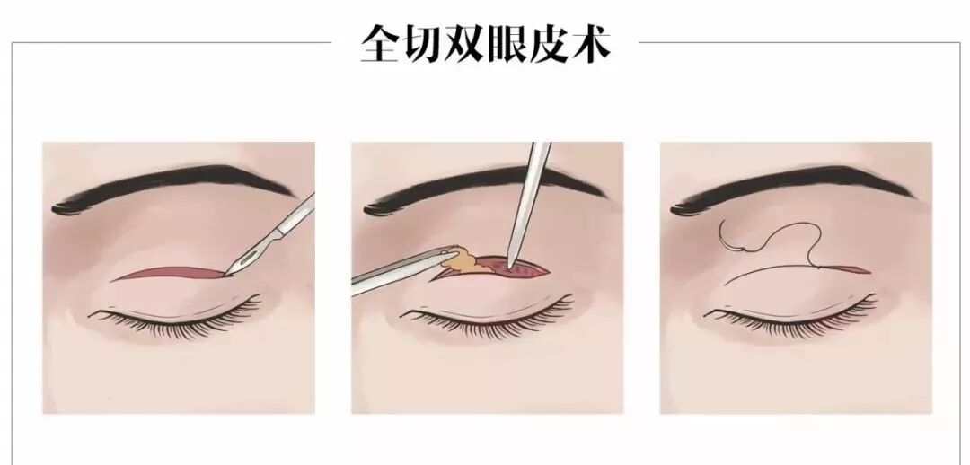 在上眼皮处作一切口,去除多余的皮肤及脂肪组织,然后将眼睑皮肤固定在所需高度的睑板上形成双眼皮。