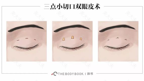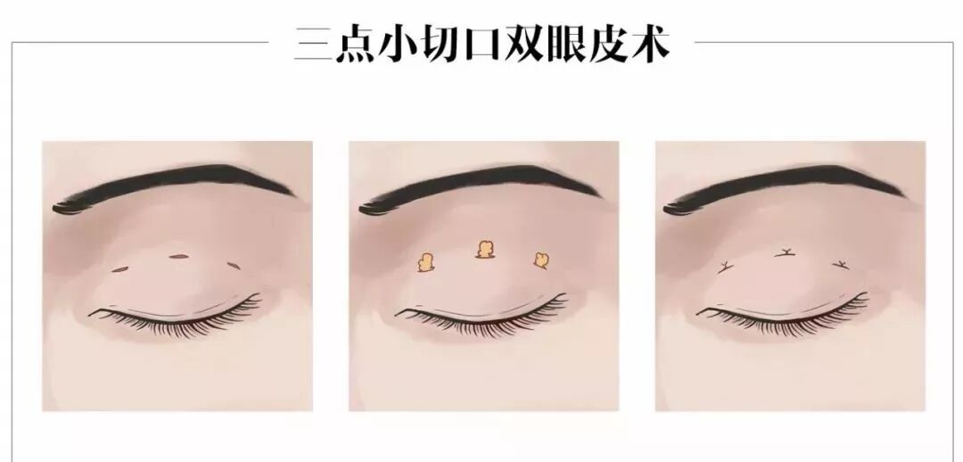 在上眼皮上做3个2-3mm的切口,通过这些切口可以把多余松垂的脂肪取出,然后把三点缝合形成双眼皮线。