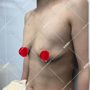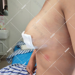 胸部伤口清洁干燥,恢复情况良好,没有淤血现象,假体无偏移。