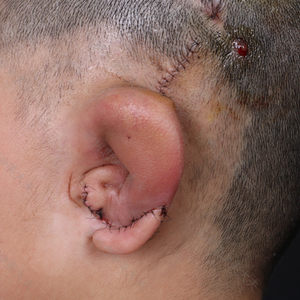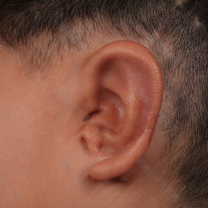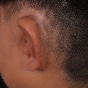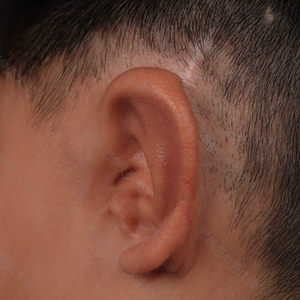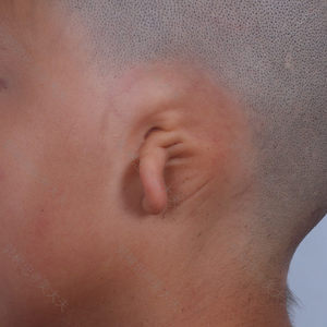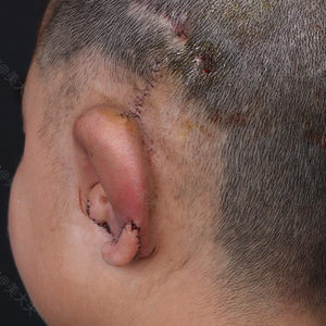 这是我家孩子二期术后一年左右,到院复查。 此时再造的耳朵已基本消肿,颜色与周边皮肤颜色一致,再造部分的耳朵与原有耳垂衔接处疤痕基本看不出来,孩子和我们都十分满意手术效果。