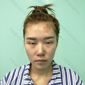 面部扁平,双眼皮上睑下垂严重,脂肪多,鼻头肥大。