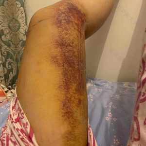 大腿吸脂将近一个多月了我这腿子恢复还算是挺快的,恢复期时配合着消炎药吃恢复的真的挺快的,也可能是我体质的原因吧,淤青几乎消散完了。