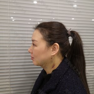 右眼上睑下垂,导致大小眼,双眼皮不流畅。 下颌缘轮廓不清晰,双下巴突出。