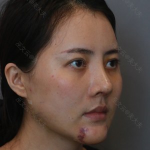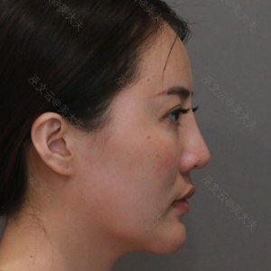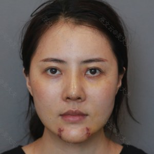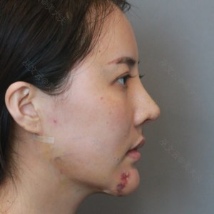 鼻子恢复的很好,拆线后基本形态已经显现,鼻尖高度、翘度完美。因为做了下颏部吸脂,下颏部伤口还未完全恢复,过几天淤血消退就好了。