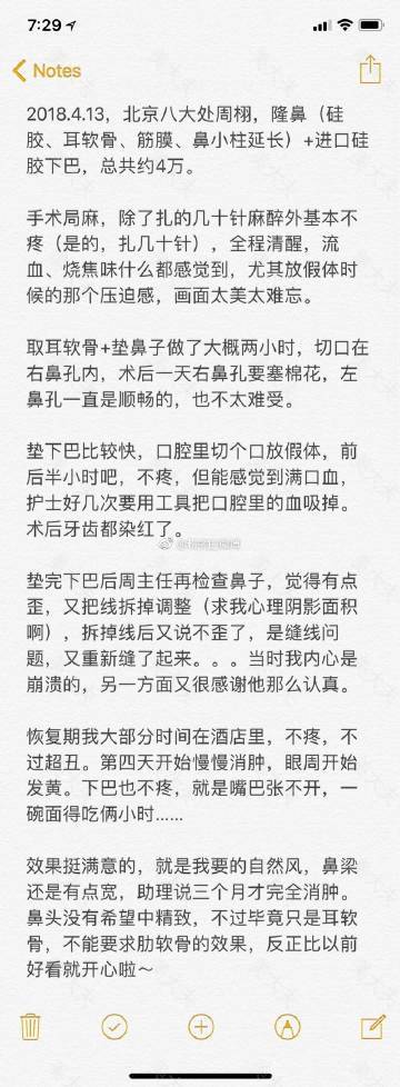粉熊的微博一鼻整形投稿2018年7月,北京八大处,周栩,全肋鼻综合,四万。