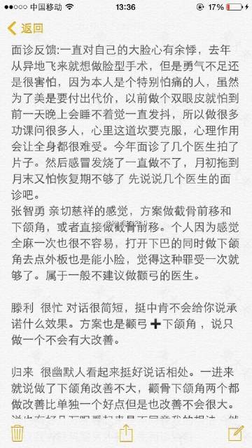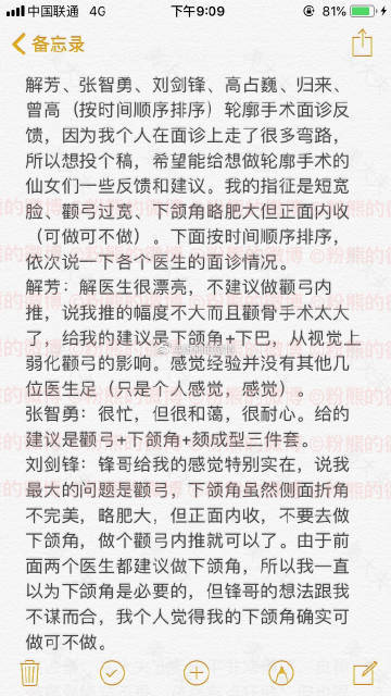 张智勇,滕利,归来,曾高,高占巍,刘剑锋,邵祯面诊反馈。姑娘详细记录,虽然多,但是文字表达很清楚,看得很轻松。希望对打算做脸型的姑娘有所帮助。