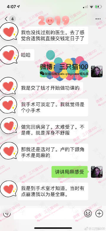 妹子就是西安本地人,做手术一直很淡定,做的是局麻。卢丙仑的局麻方式是,“先给你全麻大约10分钟就醒了,全麻是为了给整个下颌角打局麻针。貌似一边共要打11针左右。整个手术自己的意识是清醒的。”