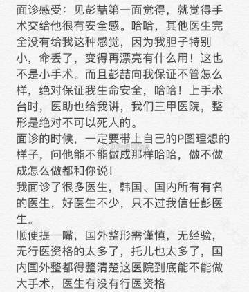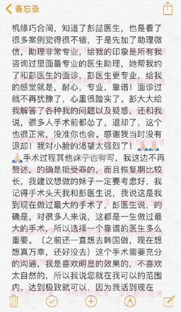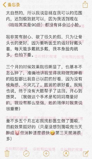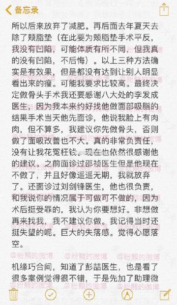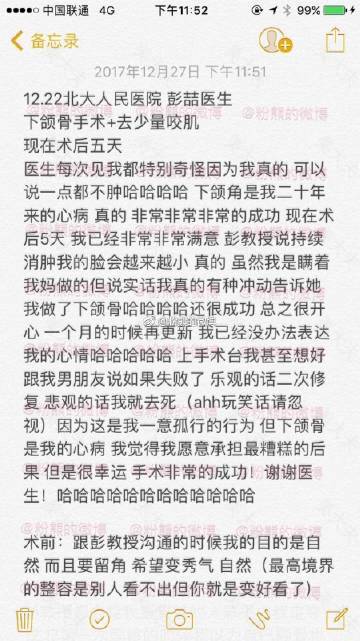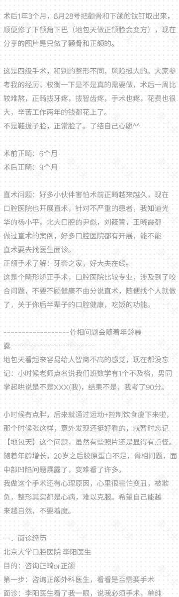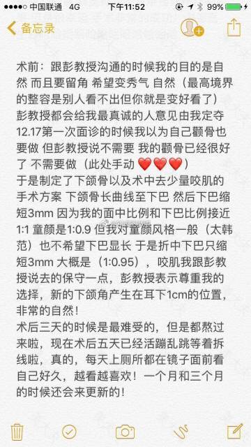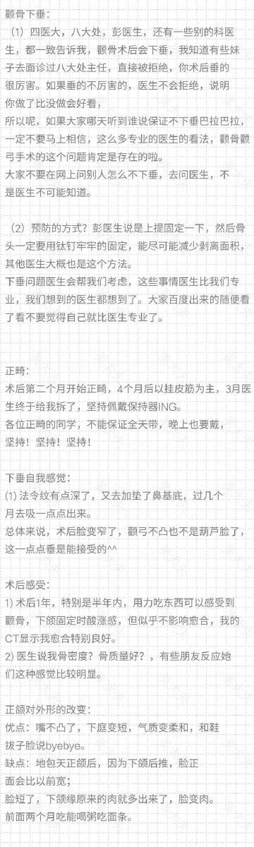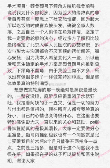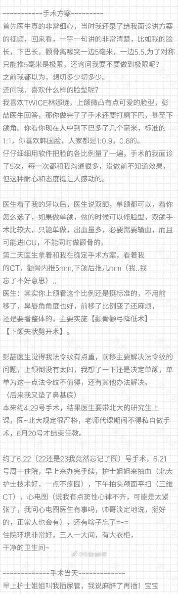 妹子没有写文案,几乎都是口述,我来总结一下儿,术前她是自己ps了效果图儿,彭喆照着做的。她觉的彭喆比较能倾听患者诉求,下颌角留角位置、颧弓推多少都是妹子自己要求的,医生照着定的方案。