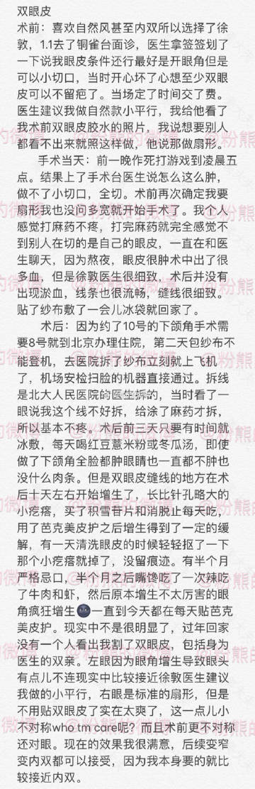 #粉熊的微博一双眼皮投稿##粉熊的微博一脸型投稿#2018.1.7,成都铜雀台,徐敦医生,全切双眼皮➕开眼角,8800。2018.1.10h北京北京大学人民医院,彭喆医生,下颌角长曲线截骨,42000。