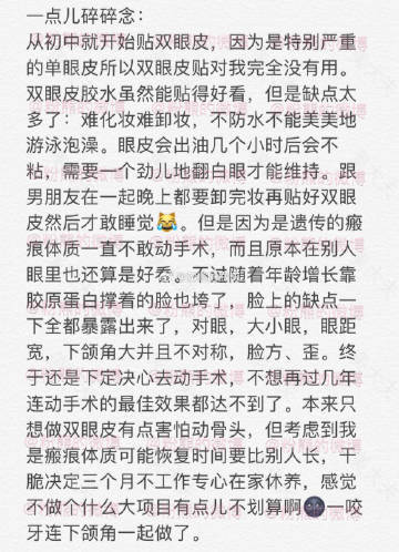 切的多不多,我觉得还真是和自我评价有关,我有个闺蜜做了,做完以后觉得自己脸还不够小,结果拿以前照片一比,靠那个大方脸真是自己?