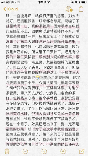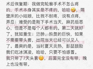 妹子说了一个细节,她老公不知道她手术,术后她回家跟老公说自己打了个瘦脸针,比别人肿一些,她的钢铁直男老公就信了只做下颌角的妹子,大家可以参考一下。