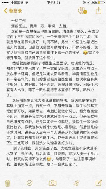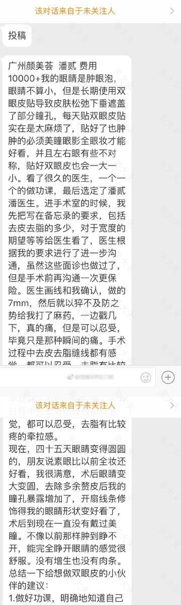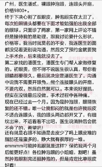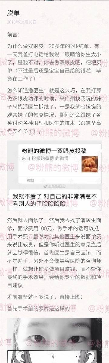 粉熊的微博一双眼皮投稿2018.10.2,广州颜美荟,潘贰,单全切,费用1w+。选择医生是最重要的,选了之后就相信他吧,然后就一切随缘了双眼皮