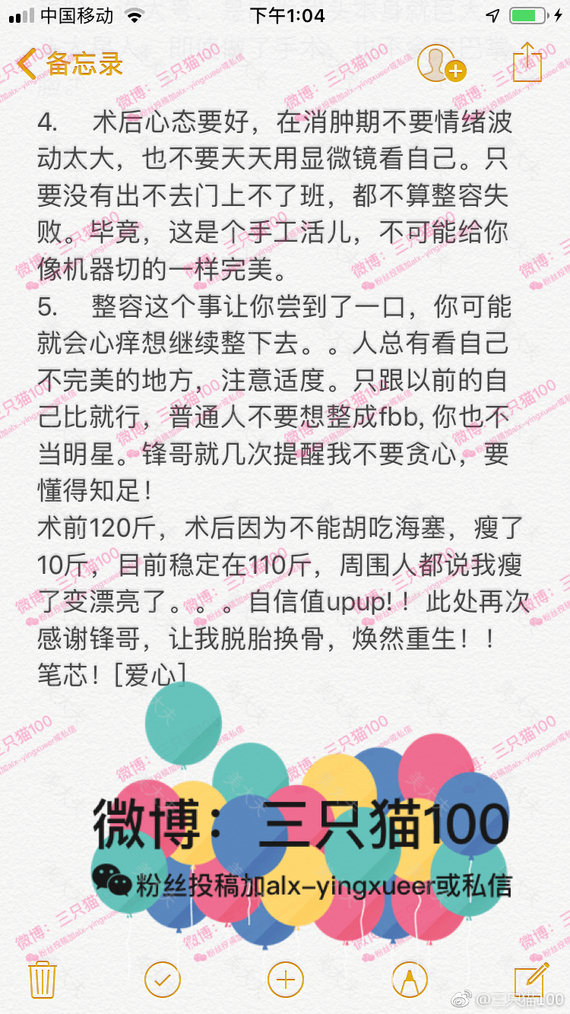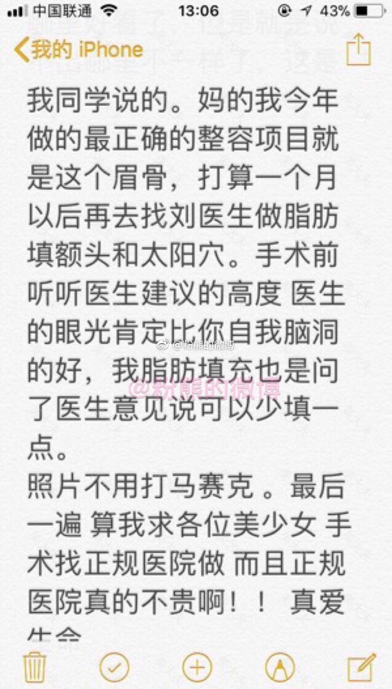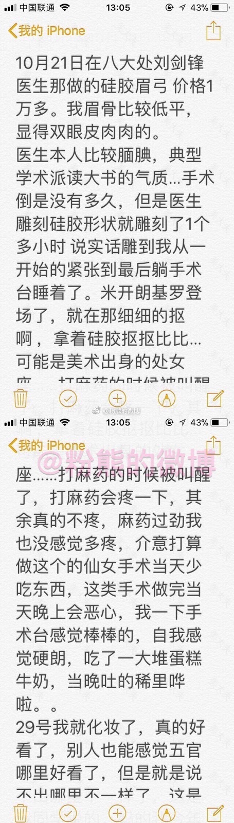 总而言之,刘医生真的很把患者的要求当回事儿,也能很耐心的倾听你的审美并落实到点子上。术后关怀做的也很让人安心!还有,想手术的姐妹们,为了能让自己术后满意,请你们术前一定要清楚自己的审美,精确到细节后再和医生沟通,才能不枉自己全麻遭的罪!