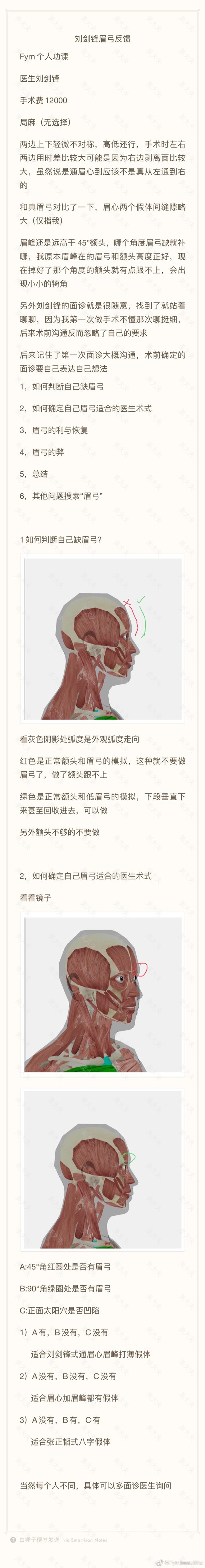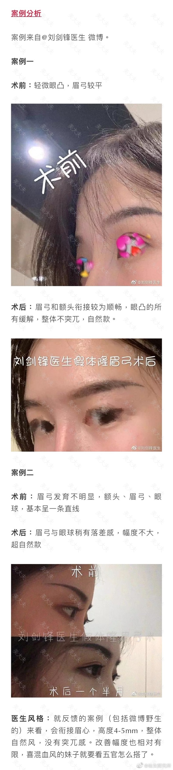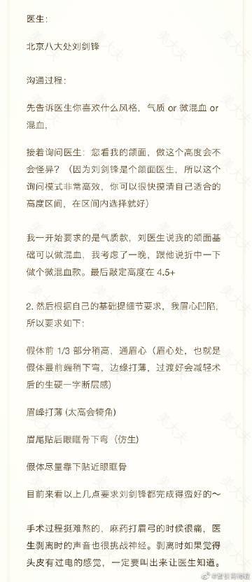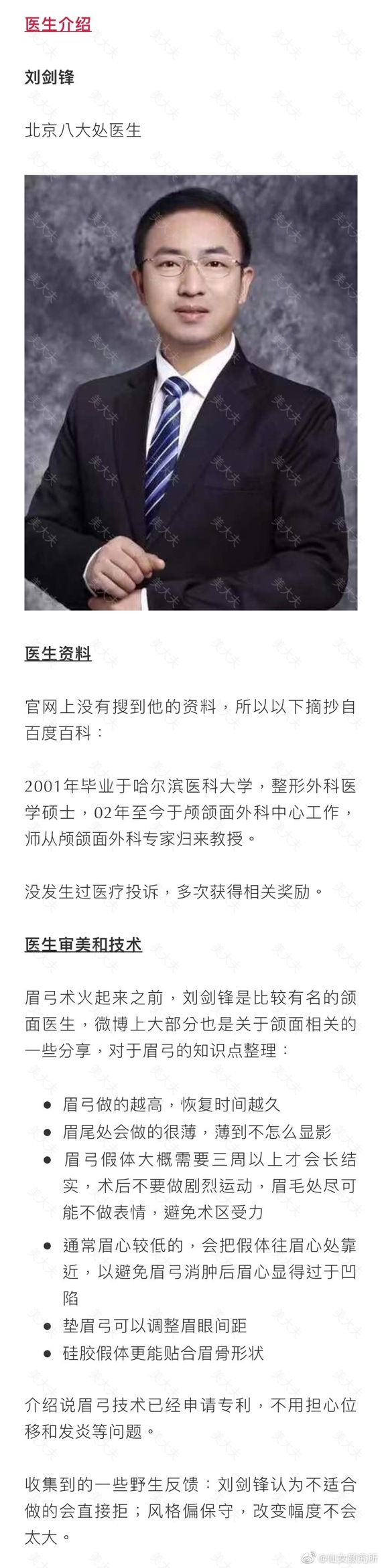 最终被刘剑锋打动,刘剑锋比较擅长做一些眉心,适合我这种没有眉心三角的人,且长期积累的手术量导致他比较稳定,眉峰现在已经没有小龙人的现象了。