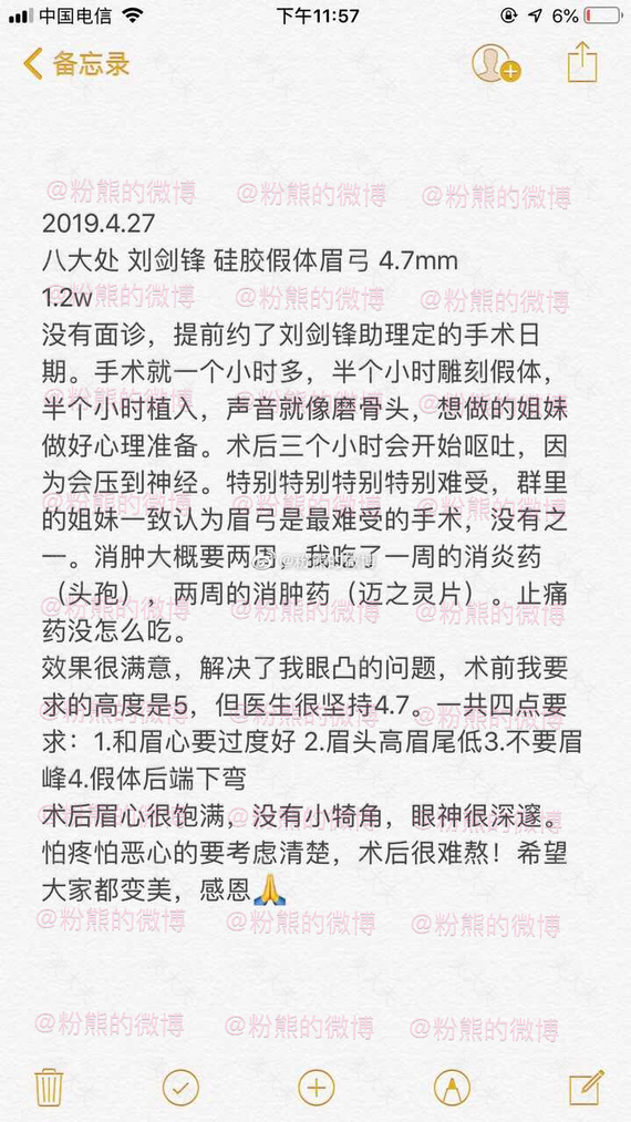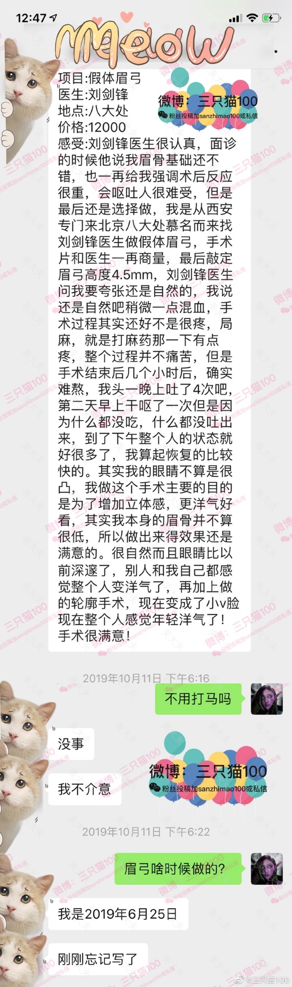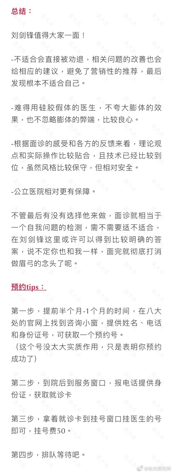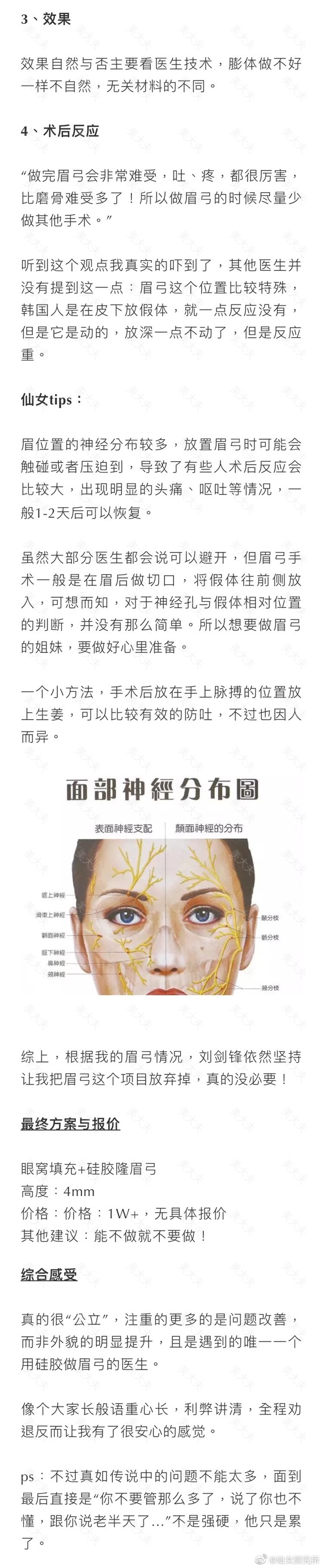 最终被刘剑锋打动,刘剑锋比较擅长做一些眉心,适合我这种没有眉心三角的人,且长期积累的手术量导致他比较稳定,眉峰现在已经没有小龙人的现象了。
