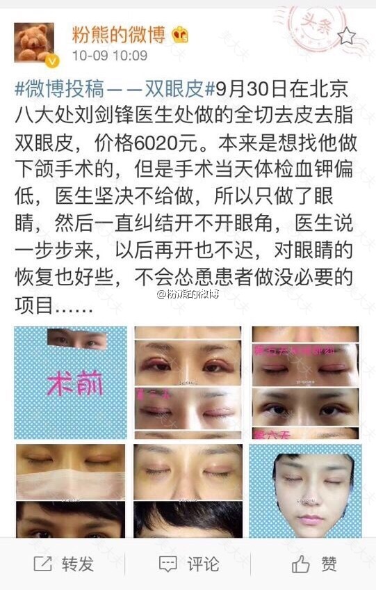 #微博投稿——双眼皮#9月30日在北京八大处刘剑锋医生处做的全切去皮去脂双眼皮,价格6020元。今天是第22天,之前做完后发现眼角有分叉,而且一天比一天严重,当时都担心做坏了……第10天在分叉的地方用美皮护24小时压住贴着,伴随着眼睛消肿,现在完全没有分叉的痕迹了……