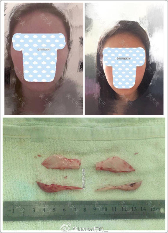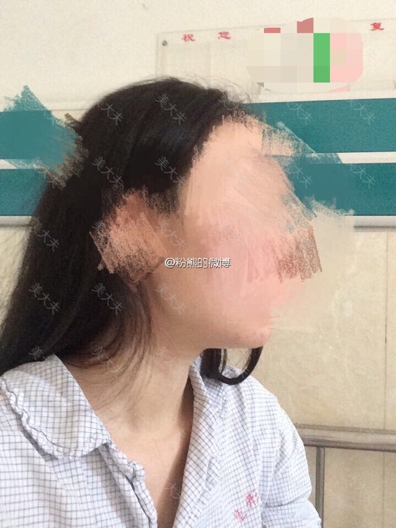 #微博投稿——脸型#4月22日在北京八大处刘剑锋医生处做了下颌角➕劈外板。价格三万,住院七天。银行卡出了问题,医生借钱。医生看了片子后说神经线很低很低,截不了多少,尽力在安全得范围内多截点,外板多去一点!正好符合心意,就是想正面多。散下来头发的四张是术前,后三张是术后第四天。