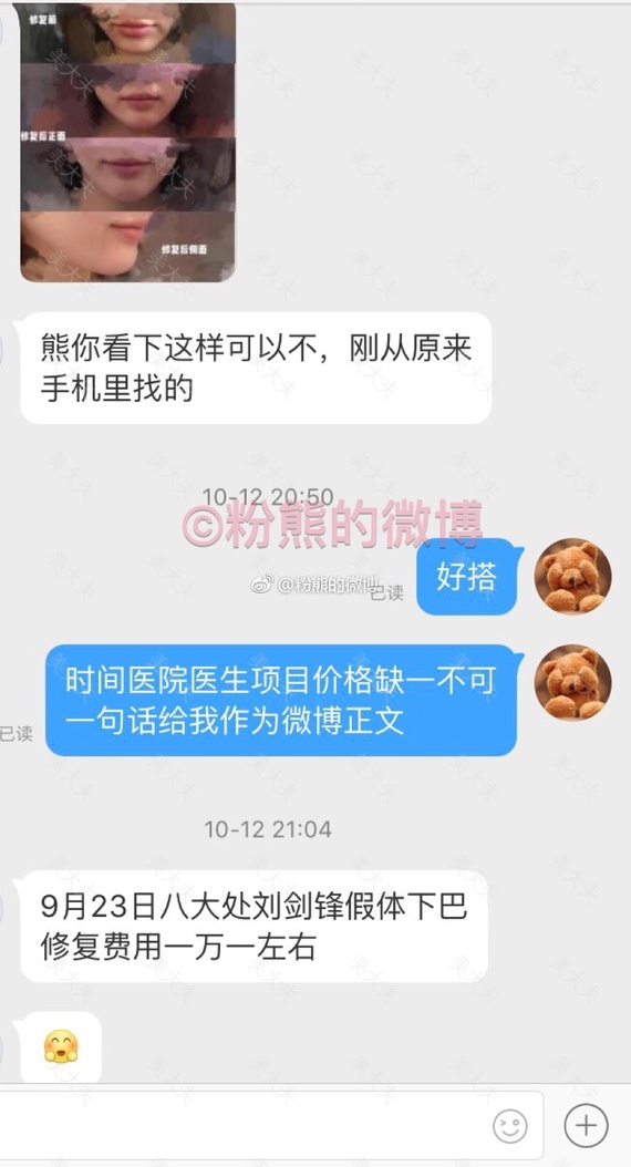 #粉熊的微博一下巴投稿# 9月23日在八大处刘剑锋医生处做的假体下巴修复,费用一万一左右。