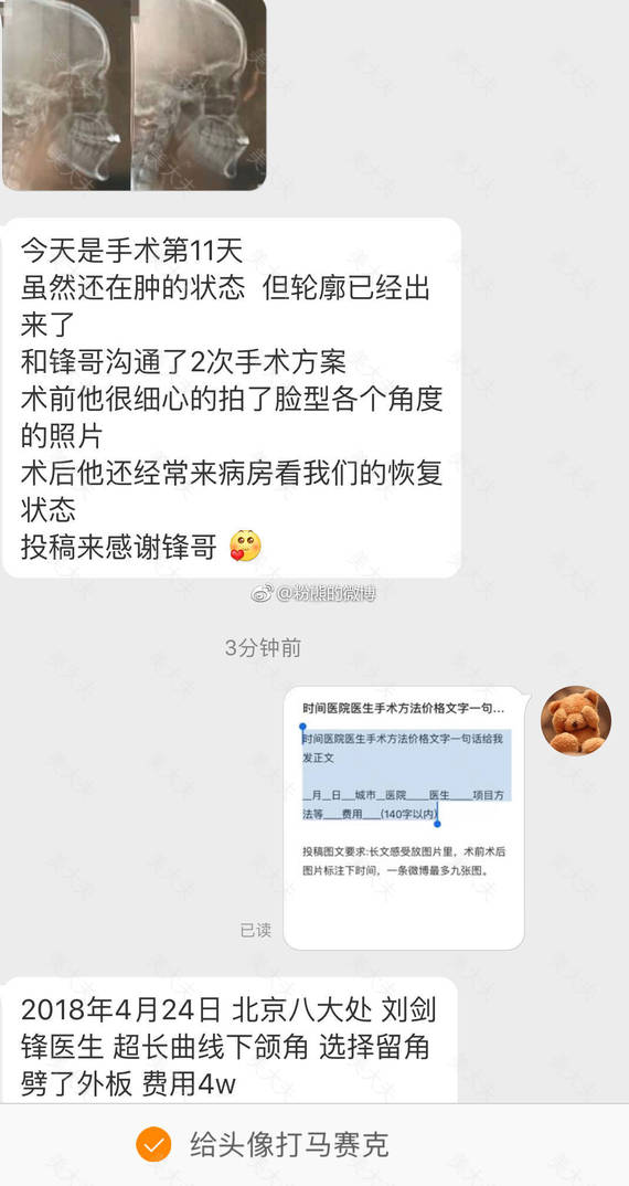 #粉熊的微博一脸型投稿#9月14号,北京八大处刘剑锋,下颌角手术,费用三万五左右。